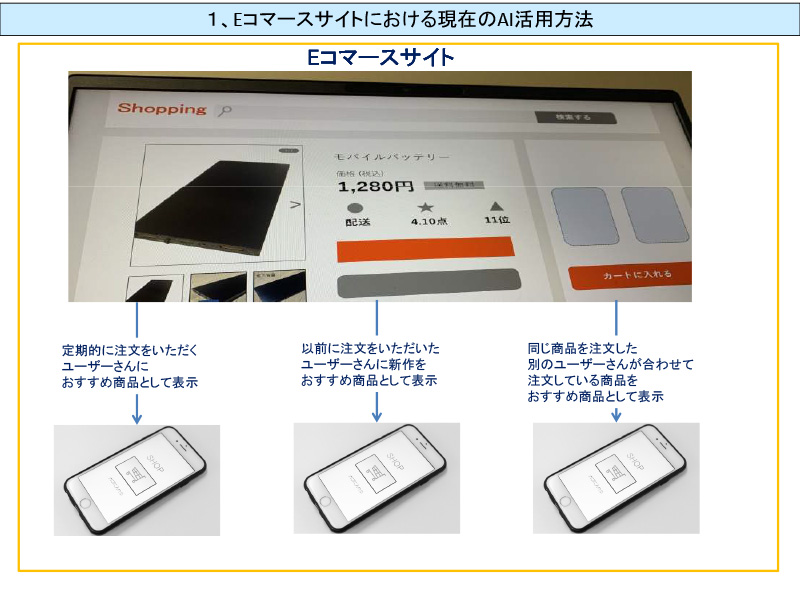 ということで、先ずは今現在実際にEコマースサイトにて活用されているAI機能について説明させていただきますと、最もポピュラーな使用方法はユーザーさん毎で今までの注文履歴を元におすすめ商品を目立つポジションに表示させることでしょうか。よくあるケースとしましては対象品が消耗品である場合、同品目をあるユーザーさんが凡そ半年ごとに注文されていたとしますと前回注文後5カ月近く経過した時点でその商品をお奨めとして表示させると効果的であるかと思います。また同じような手法として書籍や動画販売の場合同じシリーズを毎回購入されているユーザーさんがいらっしゃいましたら、同シリーズの新作が出た時点で同品目をお奨め商品として目立つポジションに表示させたり、それから注文履歴を元にして同じ商品を注文した別のユーザーさんが合わせて注文している商品をお奨めとして表示したりといった手法は現在一般的に使用されております。