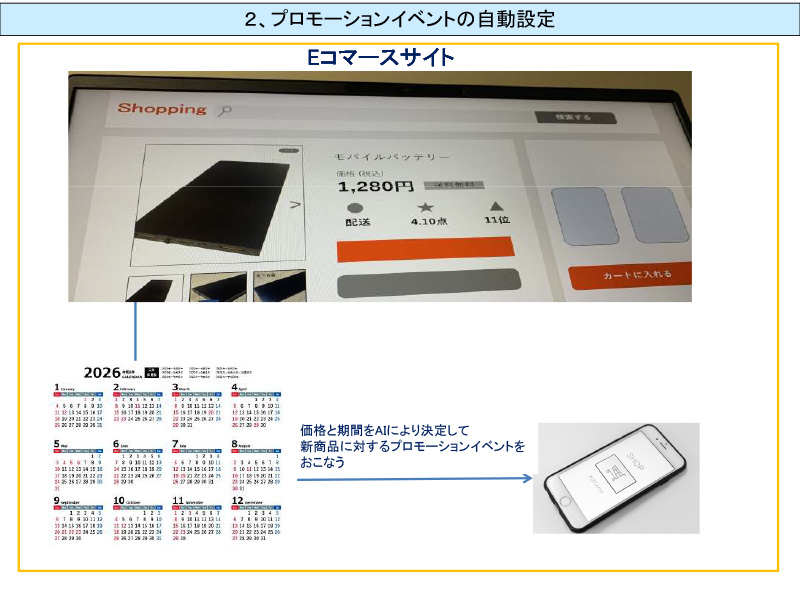 前項の内容がどちらかと言えば受動的なアクションであるのに対して、今度は能動的なアクションについて考えてみたいと思います。具体的には表題にありますプロモーションイベントを自動発生させてやろうというもので、通常プロモーションをおこなう目的としては先ず新製品の宣伝が挙げられますでしょうか。そこで新製品の発表時には標準価格よりもいくらか値段を下げたお買い得価格にて販売するようなロジックを組み込んで置き、サイトのおすすめ商品として目立つポジションに表示する形としておきます。ただこの値引き価格を決定するロジックについては少し頭を絞る必要があり、新しい商品の魅力を知らしめる為ですからマーケティング的に考えますと大幅な値引きをおこなえばその分派手なプロモートが行えるのですが、かと言っていつまでも原価割れの状態で販売を続けても本末転倒ですので、例えばプロモーション予算を決めておいて通常の販売価格で発生する粗利とプロモーション価格で販売した場合の粗利との差が予算額を上回った時点でイベントを終了させる形とします。その場合極端な値引きをしますとあっという間にプロモーションが終了して、結果新商品が認知されないままで終わってしまう恐れがありまして、では反対にほとんど値引きが行われない状態にしてしまいますと、プロモーションそのものが認知されないという訳の分からない状況となってしまいます。そこでその価格と売れ行きとのバランスを見ながら値引き金額をAIに決定させるという処理が必要となります。