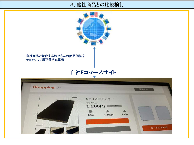 この項については更にアクティブな動きとなりまして、AI機能を自社サイトのみで完結させるのではなく外に打って出るということで、考え方としましては前回の戦略情報システムに近いのではないかと思います。要は最初に挙げさせていただいたような他のEコマースサイト等を参考にして自社商品と同等の機能を持った他社さんの商品を検索し互いの商品価格を比較する機能となります。ただ商品価格の比較と言いましても、内容量が違ったり別機能が付いていたりと単純比較をおこなうことは難しく、また比較内容を元に現状の販売実績等も考慮しながら自社商品の価格はどの程度が適正なのかをはじき出すのはかなりの難題になるかと思います。そこでここの部分は初期の段階では提示されたデータを元に人が判断する形となりまして、それでその判断結果を溜め込んでいくことにより最終的にはAIのみで適正価格を算出する形を目指します。