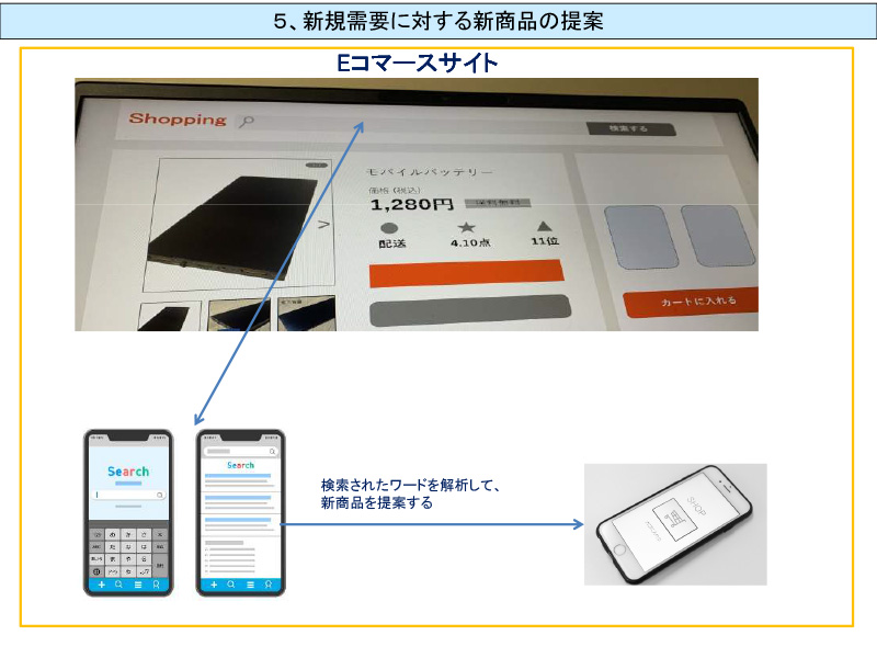 今までは現状に対する分析及び改善手法だったのですが、この項は将来を見据えたものとなります。分析手法としましては前項と少し似ているのですがサイト上の検索欄にて現在どのようなワードにより検索が行われているかに注目することにより、トレンドとなっている事象を推測して新商品のアイデアを提案するといった内容です。こちらも例を挙げて考えてみますと、検索がおこなわれたワードとして例えば「防犯カメラ」や「リモート監視」といった家屋のセキュリティ関連に関するものが多くなってきたとした場合、そういった機器を現在自社で取り扱っていないのであれば、今後その方面の需要が伸びていく可能性があると判断して関連機器の取り扱いを提案するといった形で、これは一例ではありますが、この機能については他にも様々な発展性が考えられるかと思います。