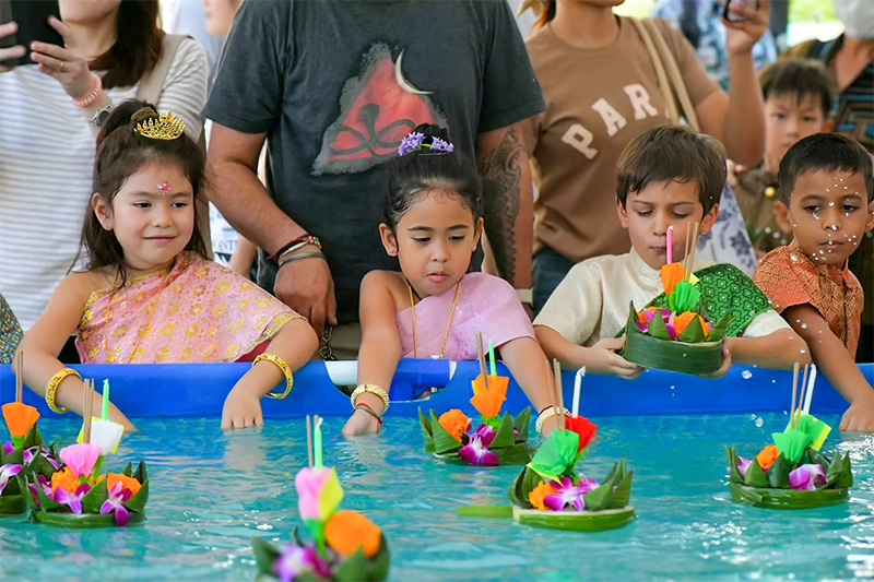 ローイクラトン(灯籠流し):トレイルで最も華やかな伝統行事の一つです。生徒はローイクラトンの起源や水の重要性について学び、自作のクラトン(花を飾った灯籠)を作ります。歌、踊り、タイの楽器演奏で祭りに参加し、保護者も含めた皆が伝統衣装を身にまといます。屋外ステージでの華やかなパフォーマンスの後、生徒と保護者は校内でクラトンを水に浮かべます。