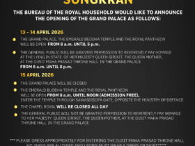 【タイ】タイ王室は、4月13日から15日にかけてのソンクラーン(タイ正月)における王宮の公開日程を発表した。15日は原則、終日閉鎖となる。