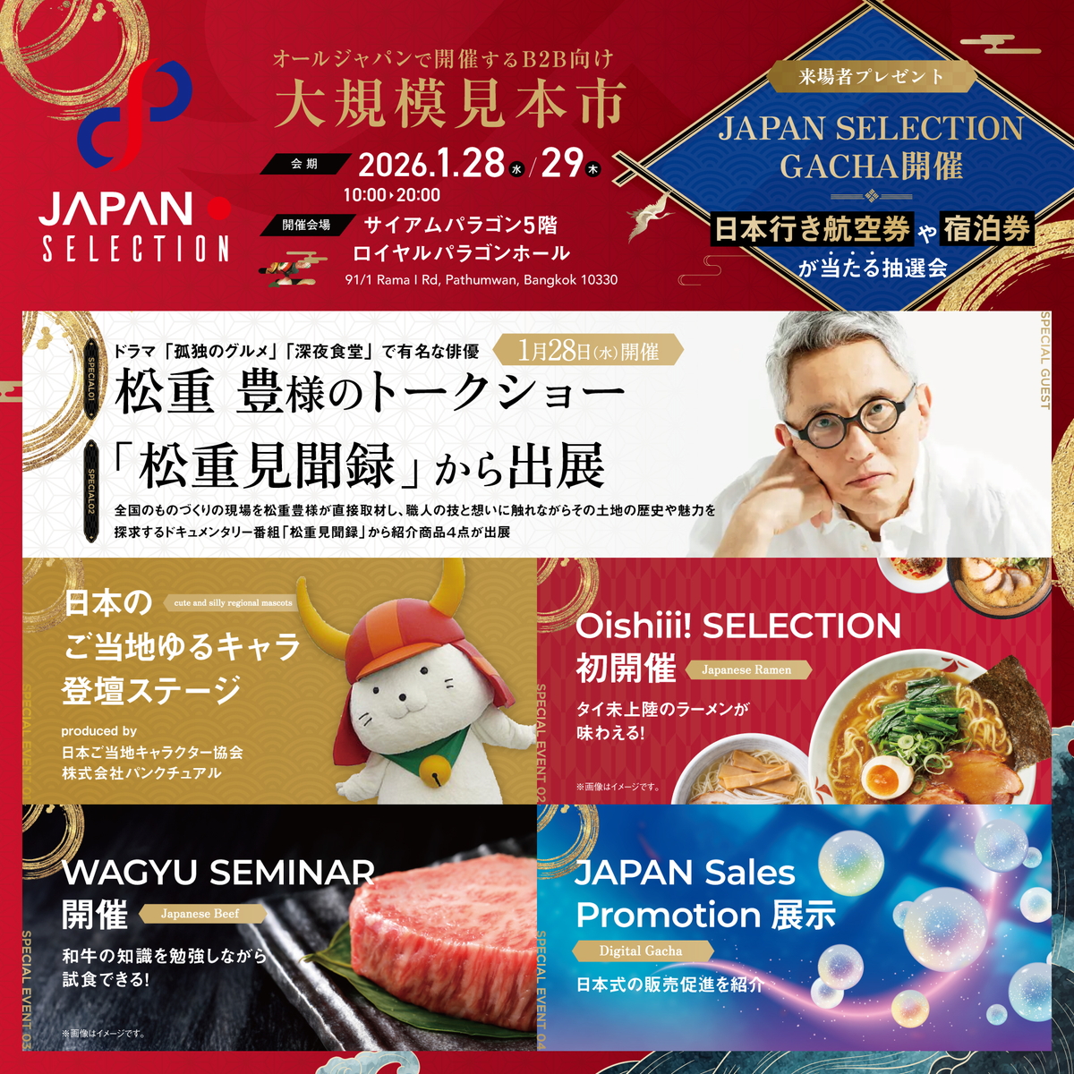また、スペシャルゲストに松重豊さんを迎え、「JAPAN SELECTION」初日での登壇が決定致しました。松重豊さんのトークショー、日本のご当地キャラクター大集合、タイ初上陸のラーメン店が集まる「OISHII SELECTION」、和牛セミナーやギフトキャンペーンなど、来場者が楽しめる各種イベントを実施予定です。