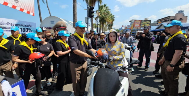 パタヤビーチロードでヘルメット着用徹底 交通事故防止へのモデル事業開始