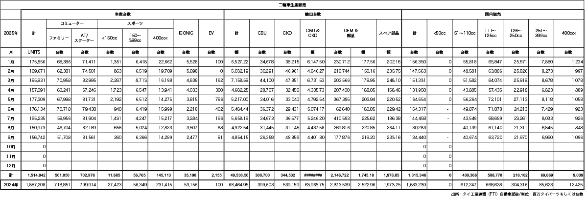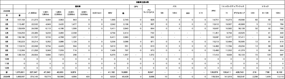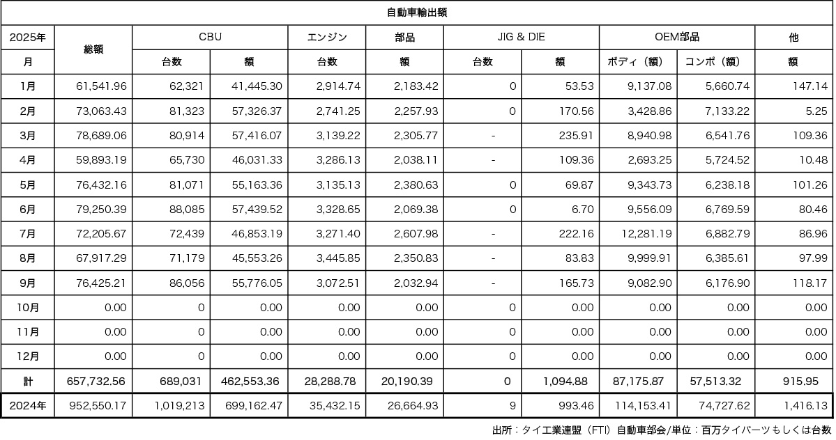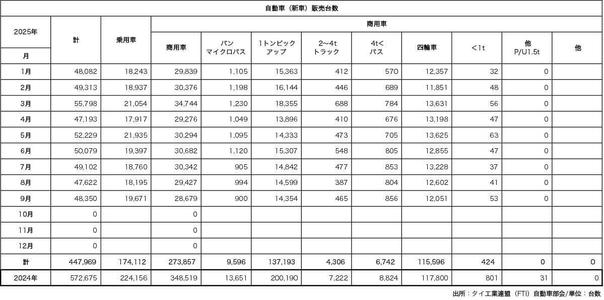 【タイ】タイ工業連盟(FTI)自動車部会の発表によると、2025年9月の自動車生産台数は前年同月比4.77%増の12万8104台だった。1~9月累計は前年同期比4.63%減の107万5801台で、相変わらずの前年比割れとなった。