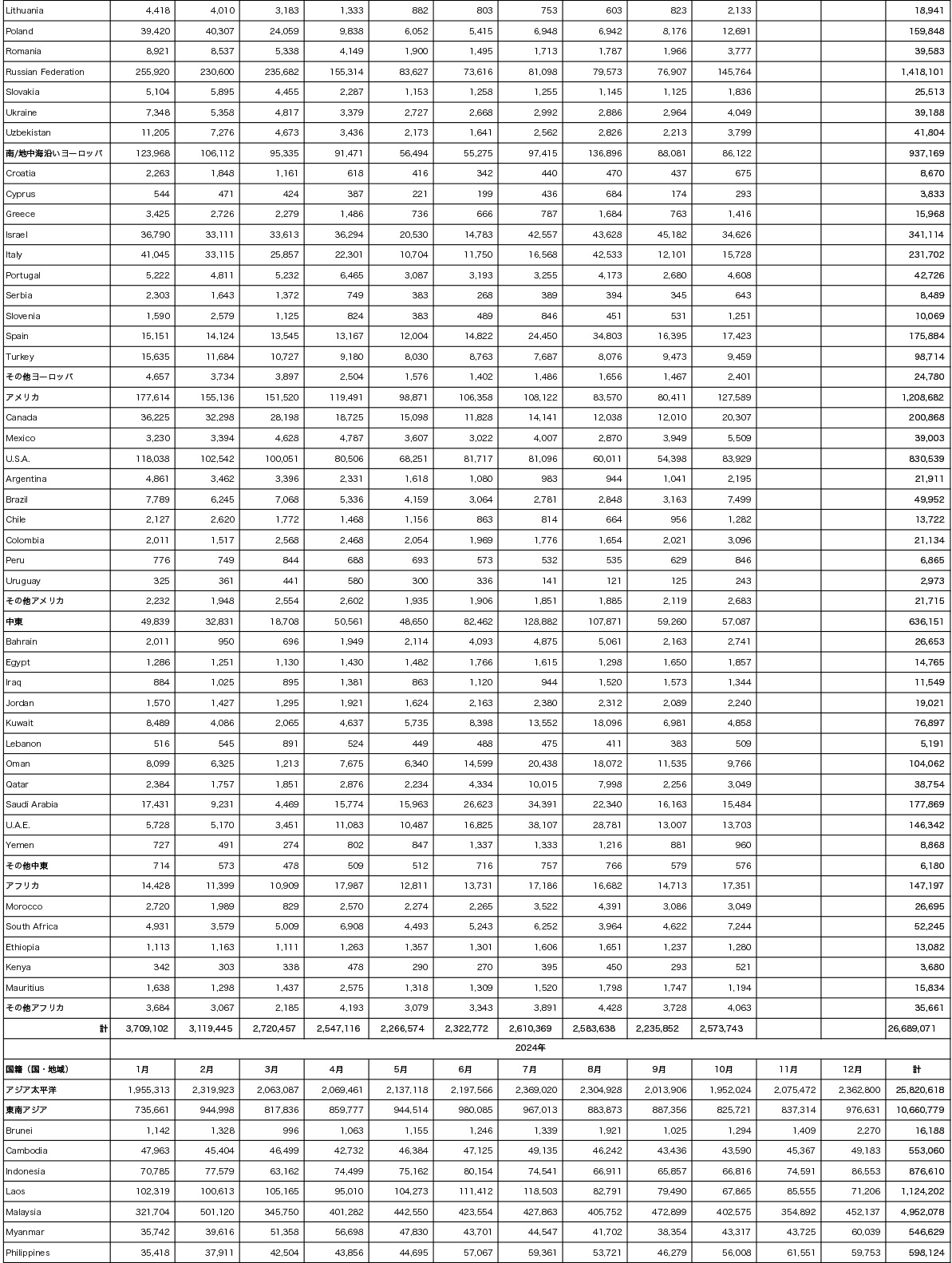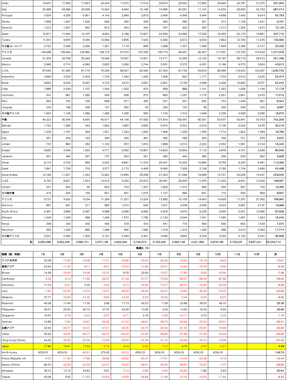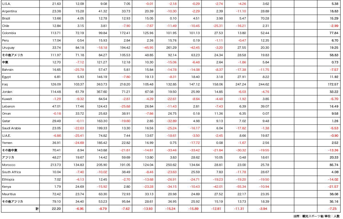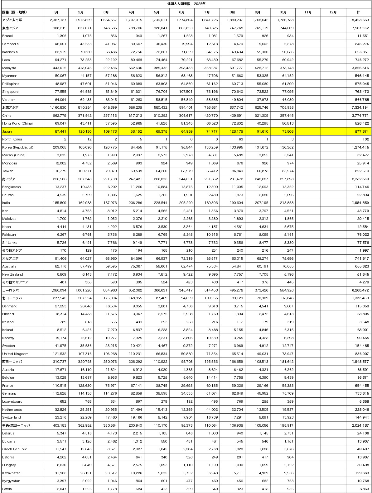 4位はロシアからで前年同月比12%増の14万5764人、5位は韓国からで同4%減の13万6382人だった。日本からは同0.3%微減の7万3806人で、前月の5位から順位を大きく落として11位となった。