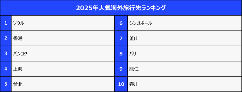 同分析によると、日本人の海外旅行先としてソウル、香港、バンコクの順で人気が引き続き高い。価格面や移動の負担を抑えつつ、満足度の高い体験を求める傾向が強まっているもよう。4位以下は、上海、台北、シンガポール、釜山、バリ、龍仁(韓国)、春川(韓国)。