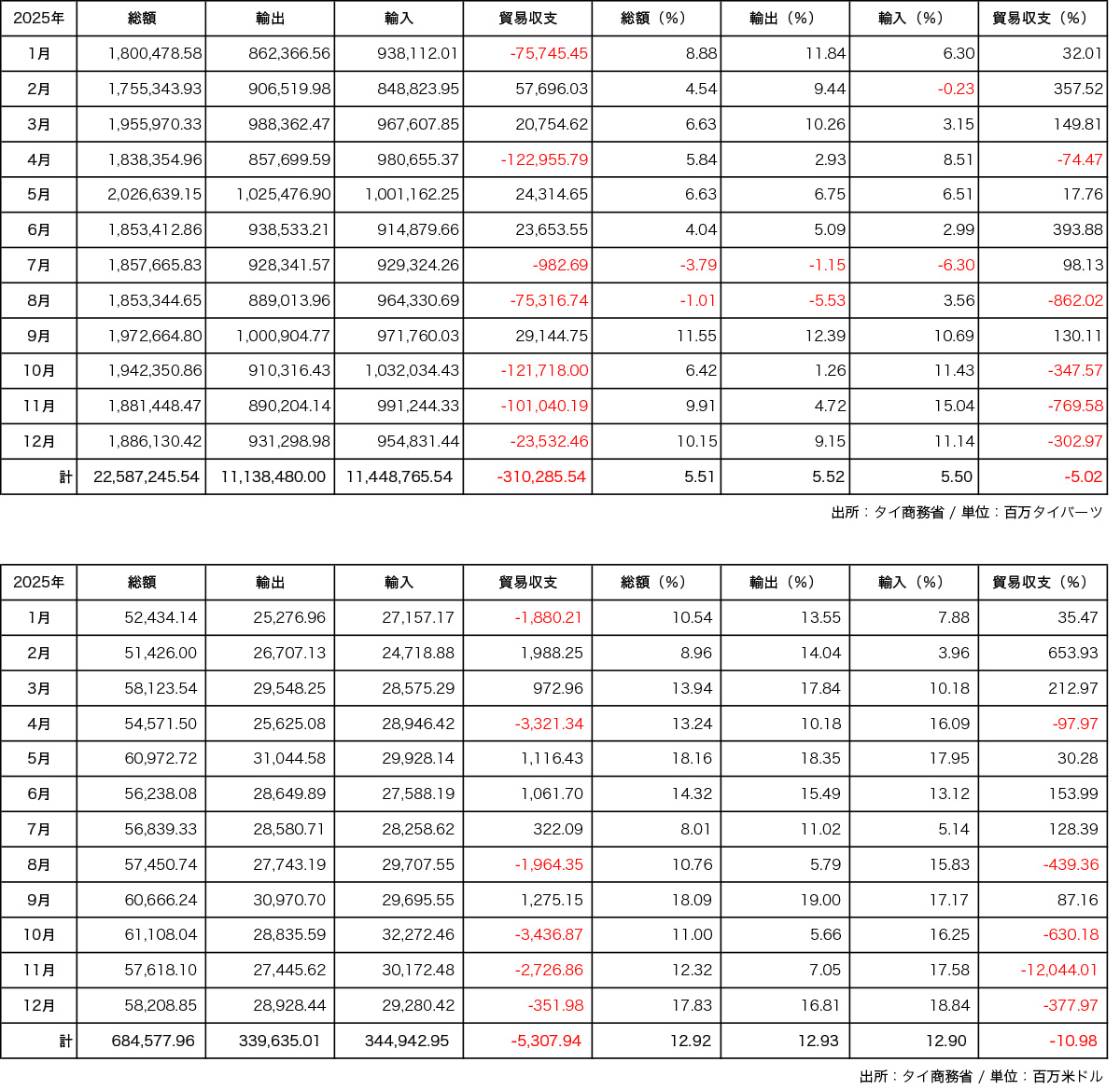 【タイ】タイ商務省が国際貿易統計(Thailand’s international trade statistics)として発表した2025年通年の輸出入額は、バーツ建てで輸出が11兆1384億8000万バーツ、輸入が11兆4487億6554万バーツで、貿易収支は3102億8554万バーツの赤字だった。前年比5.02%減。