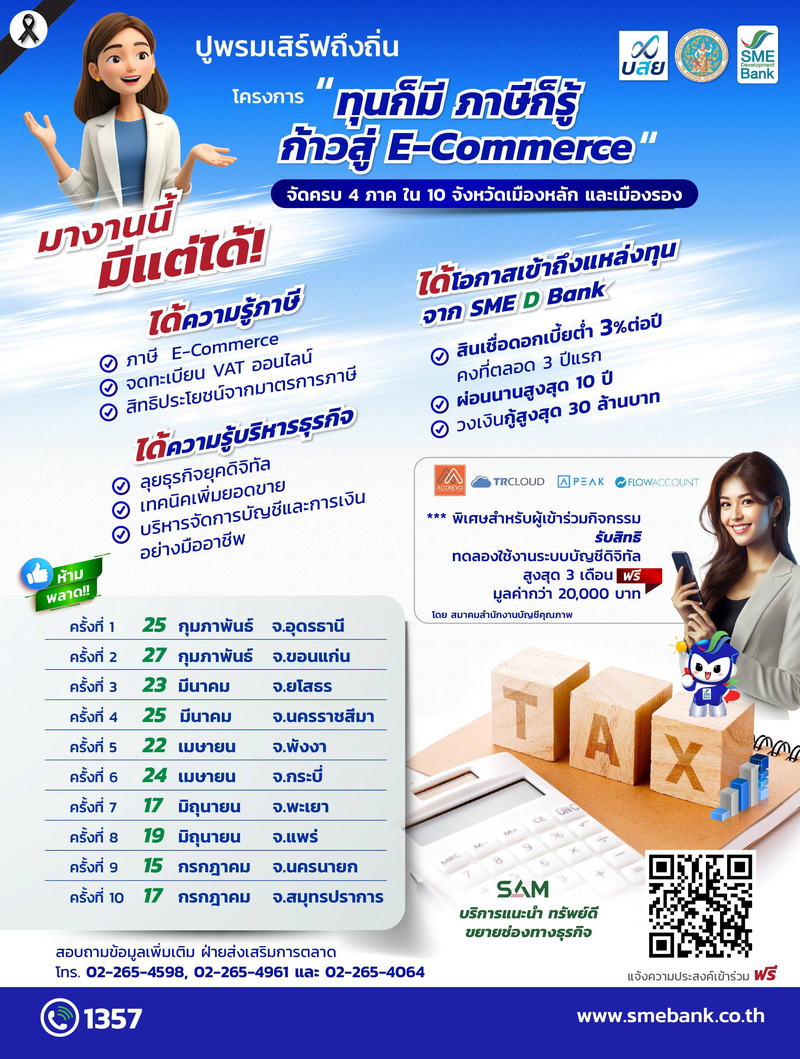 【タイ】中小企業向け金融機関のタイ中小企業開発銀行(SME D Bank)は、財務省国税局および中小企業信用保証公社(TCG)と連携し、中小企業の競争力強化を目的とした支援事業「資金も税務も理解してEコマースへ」を実施する。デジタル時代に対応した経営力の底上げを図るため、金融、税務、電子商取引に関する知識提供から低利融資への橋渡しまでを一体的に行う。