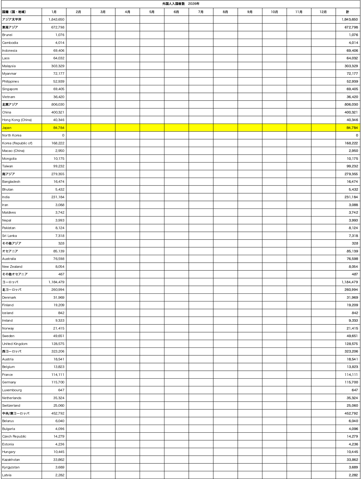 【タイ】タイ観光スポーツ省がまとめた2026年1月の外国人入国者数は、前年比12%減の327万7908人だった。タイ政府観光庁(TAT)は2026年通年の外国人入国者の3670万人達成を目指しており、1月は目標達成可能な実績といえる。