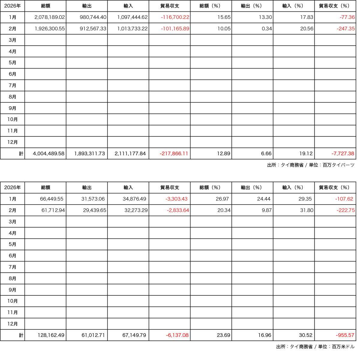 【タイ】タイ商務省が国際貿易統計(Thailand’s international trade statistics)として発表したタイの輸出入額は2026年2月、バーツ建てで輸出が9125億6733万バーツ、輸入が1兆0137億3322万バーツで、貿易収支は1011億6589万バーツの赤字だった。