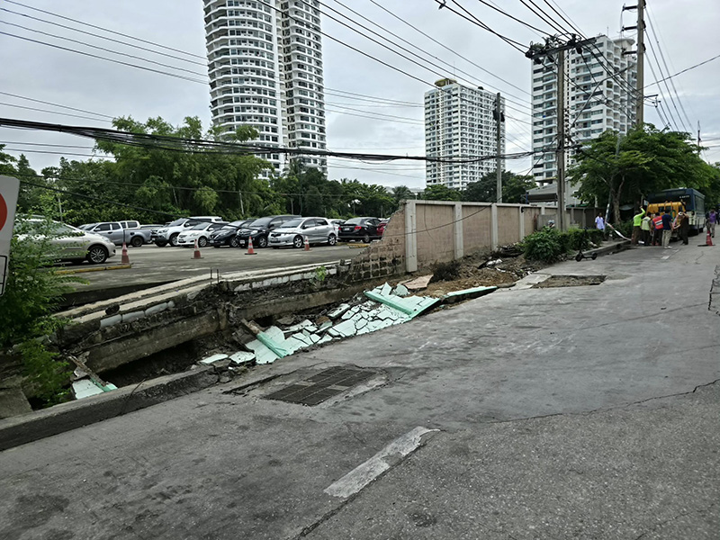 【タイ】バンコク都バーンコーレーム区内のトック通りで10月1日午前8時ごろ、道路が陥没して2車線が通行止めとなった。区役所の調査で、コンクリート舗装の下に深さ1~2メートルの空洞が確認され、陥没区間は長さ26メートル、幅9メートルに及んでいることが分かった。隣接する長さ20メートルほどの民間所有の塀も損傷した。