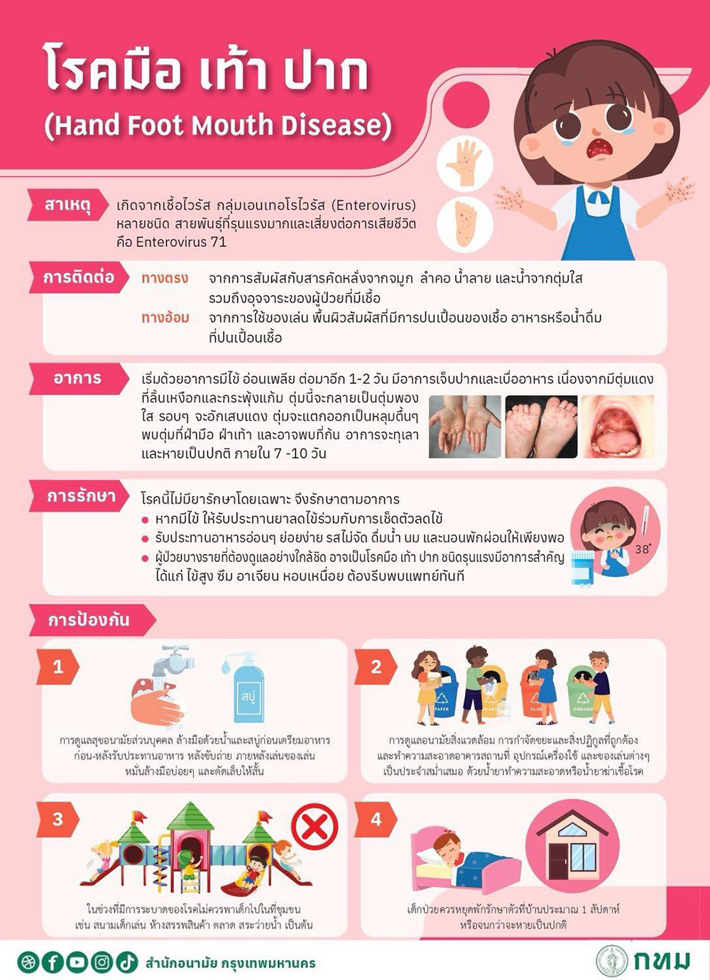【タイ】バンコク都庁(BMA)は、乳幼児を中心に流行する「手足口病」について、都民に注意を呼びかけている。感染経路は、鼻やのどの分泌物、唾液との直接的な接触のほか、汚染されたおもちゃや物の表面を介した間接的な接触によっても広がるとされる。