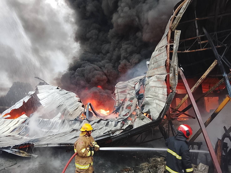 消防車20台以上が消火活動にあたったが、火勢が強かったため建物の一部が倒壊し、第2、第3倉庫に延焼した。工場は倉庫型の平屋建てで、内部にはプラスチック部品や発泡スチロール製品が保管されていた。可燃性の高い資材が多かったため、火の回りが早かったもよう。