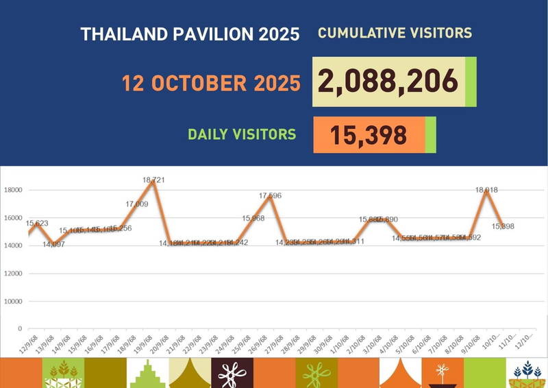 【タイ・日本】6カ月間にわたり開催された2025年大阪・関西万博が10月13日に閉幕し、タイ館公式フェイスブックによると、来場者数は4月13日から10月12日までに208万8206人に達した。最多は9月21日の1万8721人で、最終日前日も1万5398人が訪れた。
