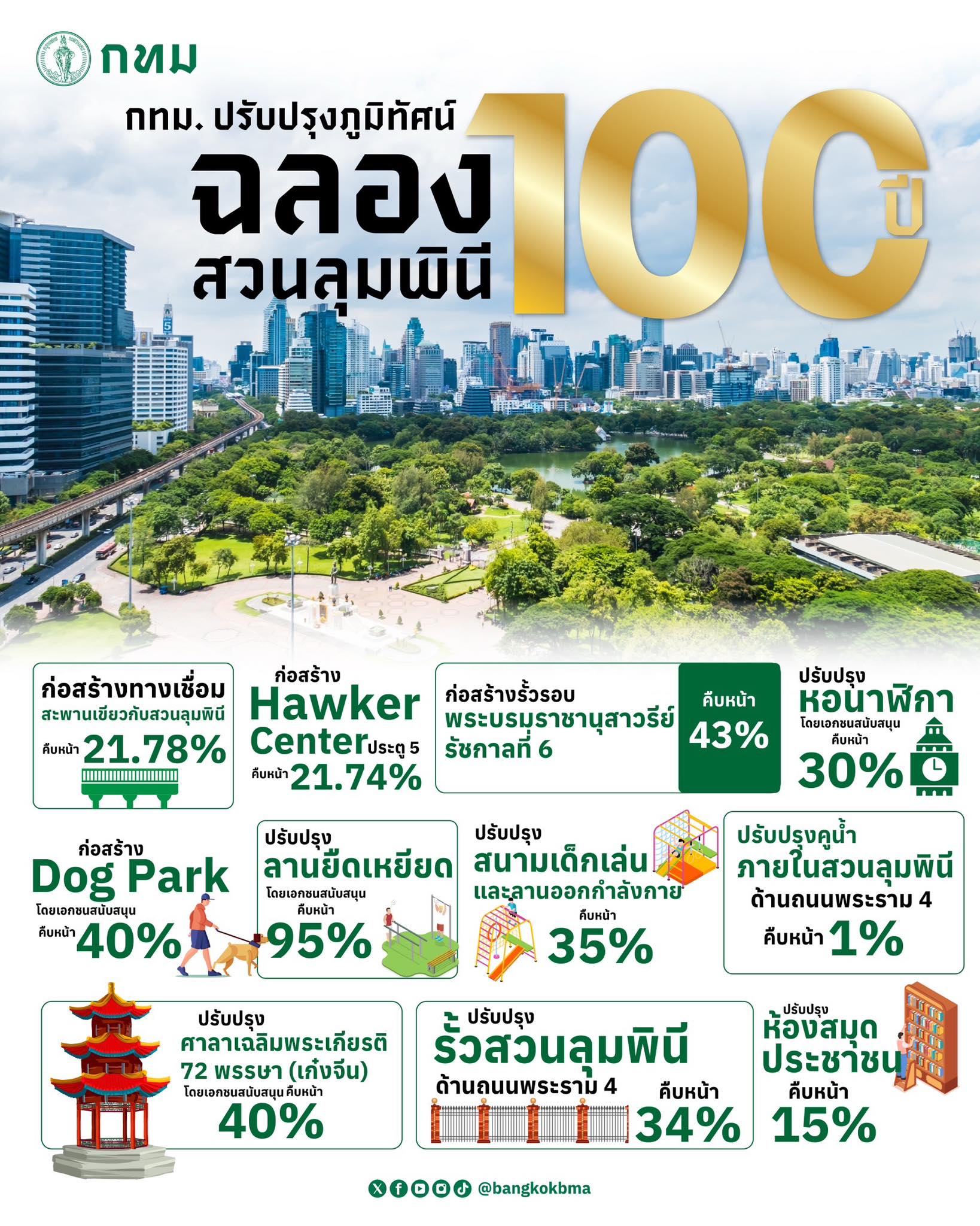 現在進行中の主な工事は、ルムピニー公園とベーンジャキティ公園を結ぶグリーンブリッジの接続通路の開発(進捗率21.78%)、第5門付近でのホーカーセンターの建設(同21.74%)、ラマ6世記念像周辺の柵設置(同43%)、時計塔の改修(同30%)、ドッグパークの建設(同40%)、ストレッチ広場の改修(同95%)、遊具や運動広場の整備(同35%)、ラマ4世通り側の堀の改修(同1%)、中国風東屋(サーラー)の改修(同40%)、外周フェンスの改修(同34%)、都民図書館の改修(同15%)など多岐にわたる。