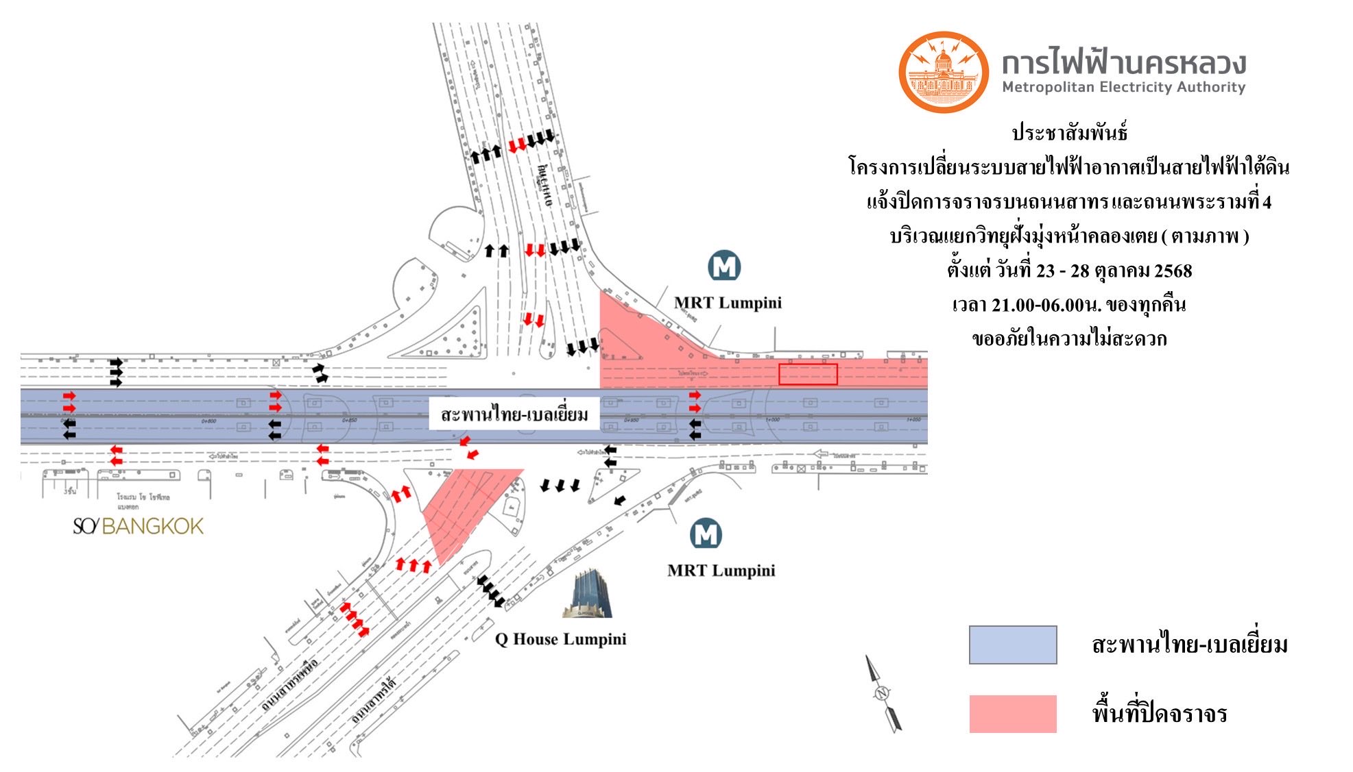 【タイ】首都電力公社(MEA)は、地中送電線の整備工事として、バンコク都心部ウィッタユ交差点で夜間、交通規制が実施されると発表した。10月23日から28日までの毎日午後9時から翌午前6時まで。