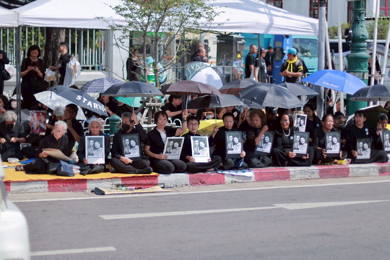 沿道には黒い服を着た国民、軍、警察、医療関係者らが並んだ。多くの国民が王太后の肖像を胸に抱き、あるいは頭上に掲げて別れを惜しんだ。棺が午後5時5分に到着した王宮では、タイ伝統の沐浴の儀と葬儀が営まれた。