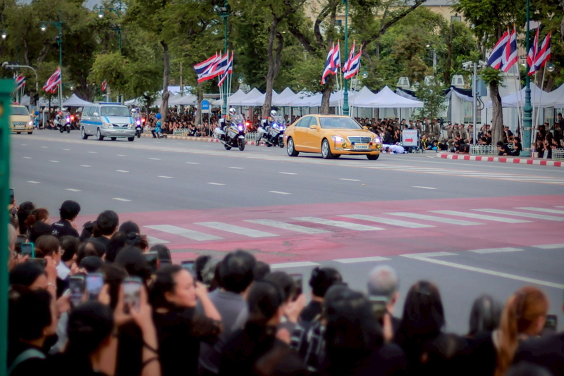 棺は午後4時26分、バンコク都内チュラーロンコーン病院を出発。国王夫妻をはじめとする王室の家族らが同行し、およそ10キロの道のりを王宮まで進んだ。棺を載せたのは、かつてラマ9世(プミポン前国王)が公務で使用し、2016年の前国王の葬送にも使われたフォルクスワーゲン製専用車だった。