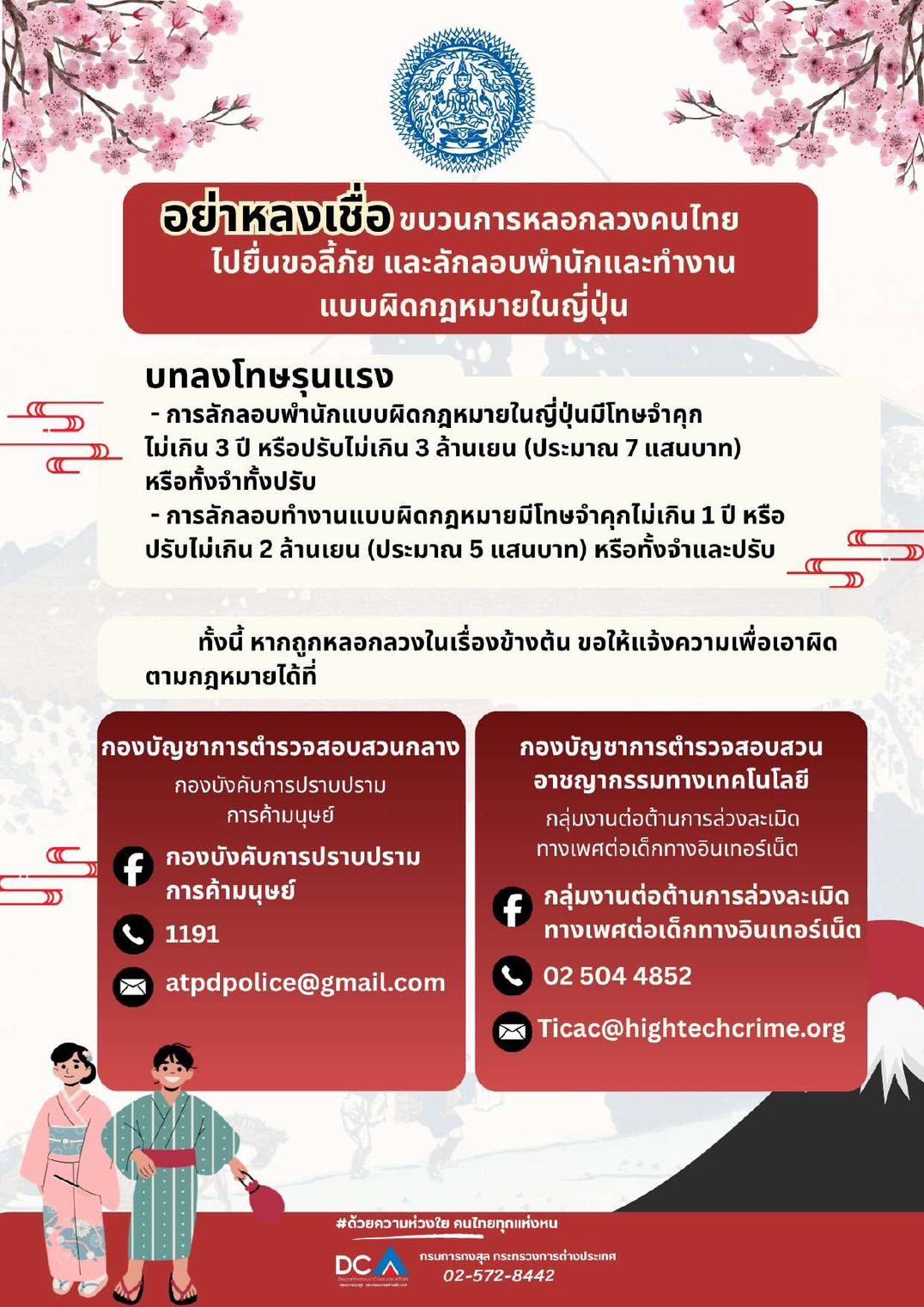 【タイ・日本】在東京タイ王国大使館が、難民申請や就労斡旋を装う詐欺グループに関する注意喚起を発し、自国民に対して違法行為に関与しないよう呼びかけた。詐欺に巻き込まれた場合は、人身取引対策部門やサイバー犯罪捜査局に通報し、法的措置を取るよう助言している。