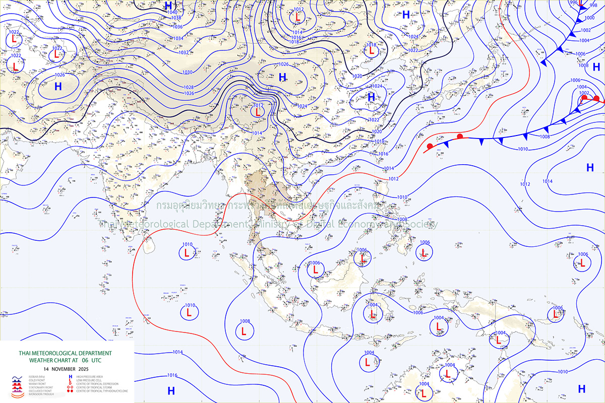タイ全土では散発的な雨が続く一方、東北地方では気温の低下と強い風が予想されている。14日から冷たい空気が流れ込んでおり、気温が徐々に下がる様子が示されている。