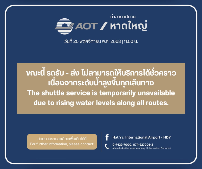 【タイ】タイ空港公社(AOT)は11月25日、タイ南部ハジャイ空港とハジャイ市街地を結ぶシャトル輸送を全面的に停止したと発表した。道路の冠水が深刻化し、使用車両での通行が不可能となったためと説明している。空軍および陸軍が軍用車を投入し、乗客の輸送を行っている。ほか、運輸省の車両によるソンクラー市内からのシャトル輸送も行わている。