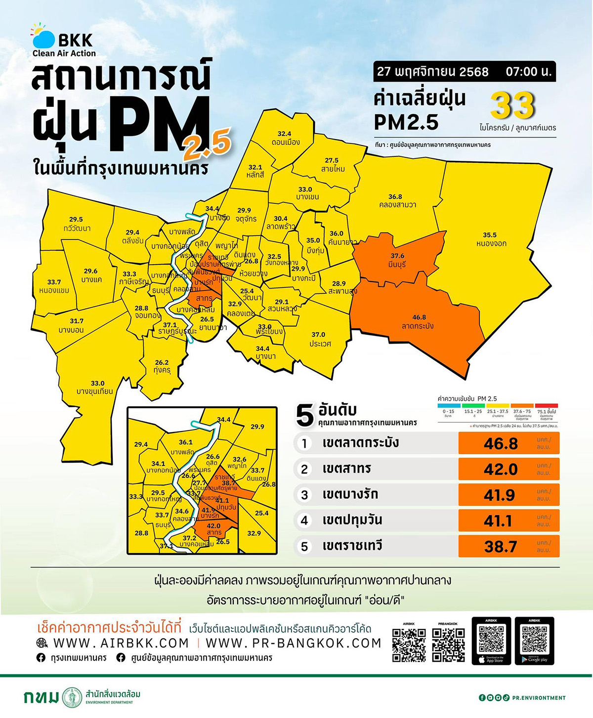 【タイ】バンコク都庁(BMA)によると、11月27日午前7時時点のバンコクでの大気汚染状況は、全50区のうち6区で「健康に被害が出始めるレベル」(オレンジ色)となった。44区はすべて「平常」(黄色)だった。バンコク全体での微小粒子状物質(PM2.5)の平均値は1立方メートル当たり33マイクログラム。
