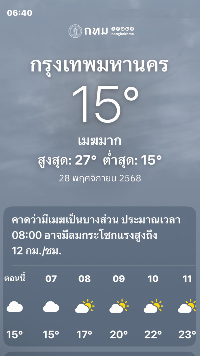 【タイ】バンコク都庁(BMA)によると、11月28日のバンコクは朝6時40分の時点で、気温が15度まで低下した。29日も朝夕は寒気を感じる天気になると予想されている。