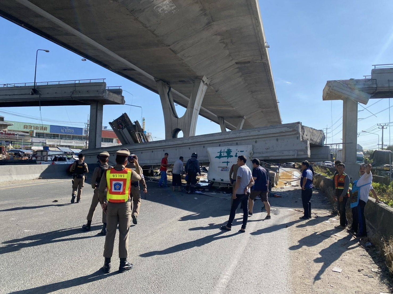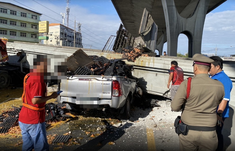 事故が起きた場所はバンナー・トラート通り上り(バンコク方面)の34キロ地点。レスキュー隊が現場に駆け付けた際にけが人3人がおり、その後にピックアップトラックのドライバーの死亡が確認された。大型トラックの荷台が橋桁に接触して落ちてきたと報じられている。クレーン車を使った橋桁の撤去作業が進められている。