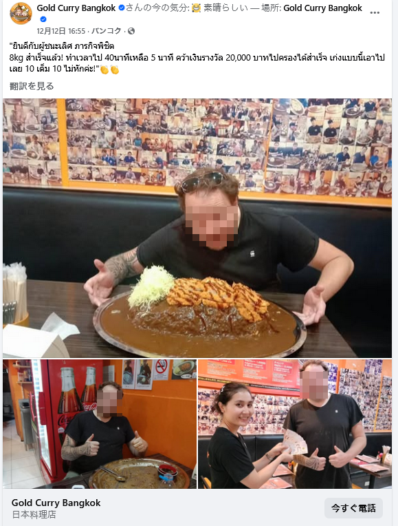 【タイ】タイの一部メディアが、バンコク都内の日系カレー店のフェイスブック投稿を引用し、同店の大食い企画で起きた不正を報じている。店側は挑戦時の不正に気付かず、賞金3万バーツ(15万円相当)を渡してしまっていた。