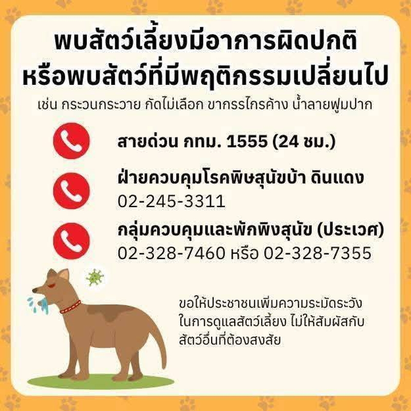 【タイ】バンコク都庁(BMA)は、バンコク都ラートクラバン区クムトーン町で狂犬病に感染した動物が確認されたことを受け、周辺住民に対し警戒を呼びかけている。対象地域は発生地点から半径5キロ圏内で、BMAが公表した地図ではバンコク、サムット・プラカーン県、チャチュンサオの3都県の県境が中心となっている。