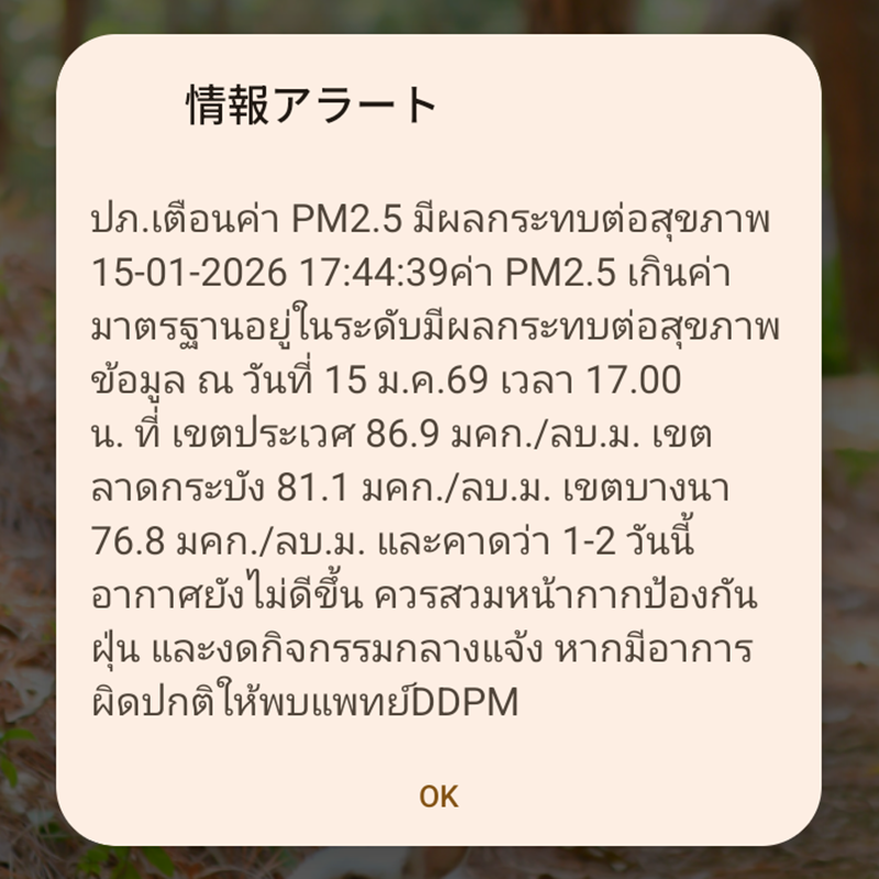 【タイ】内務省災害防止対策局(DDPM)は1月15日夜、バンコク都内の一部の区で微小粒子状物質(PM2.5)が健康に被害を及ぼす濃度に達しているとし、「災害警報システム」のメッセージをバンコク都民のモバイル端末に配信した。