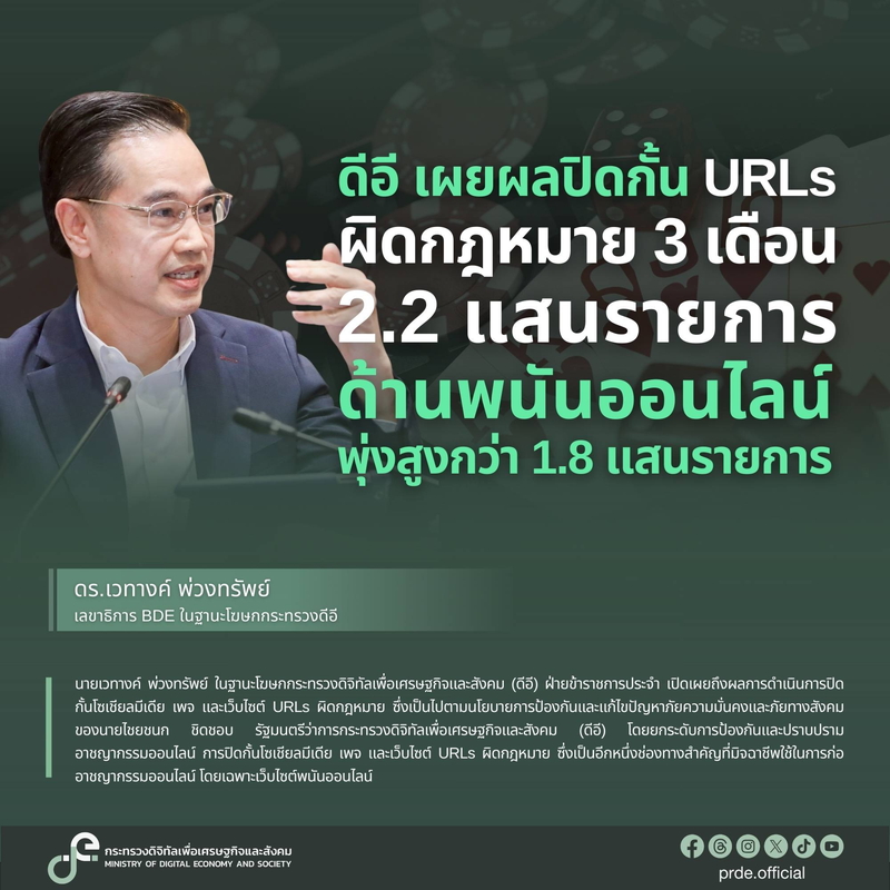 【タイ】デジタル経済社会省は1月19日、違法なホームページ、ウェブサイト、ソーシャルメディアのURLを過去3カ月で計22万486件遮断したと発表した。オンライン賭博関連が18万件を超え、全体の8割を占めた。