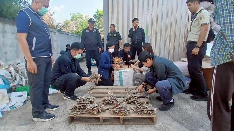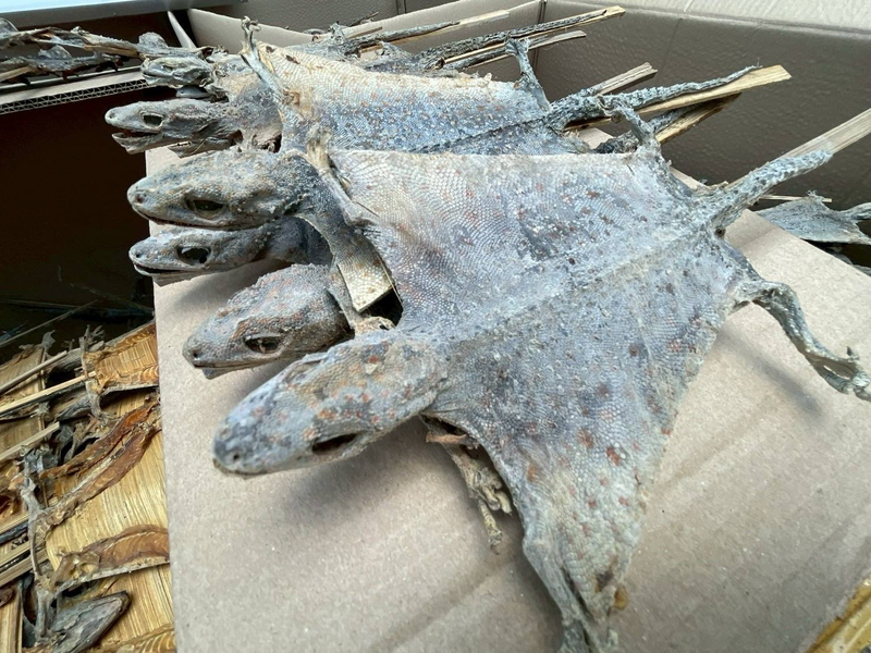 倉庫内には、出荷準備が整った乾燥ヤモリ12万4000匹が入った紙箱が積まれていた。乾燥ラン、水牛の角、木片、木粉なども発見。警察が押収し、倉庫を借りていた男女2人を拘束した。