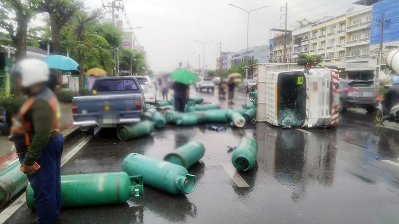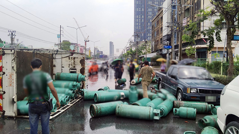 【タイ】バンコク都バーンプラット区内のシリントーン通り(下り方面)で3月16日正午すぎ、トラックが横転して積んであったガスボンベが路上に散乱する事故が起きた。人的被害は報告されていないが、周辺に渋滞を引き起こした。