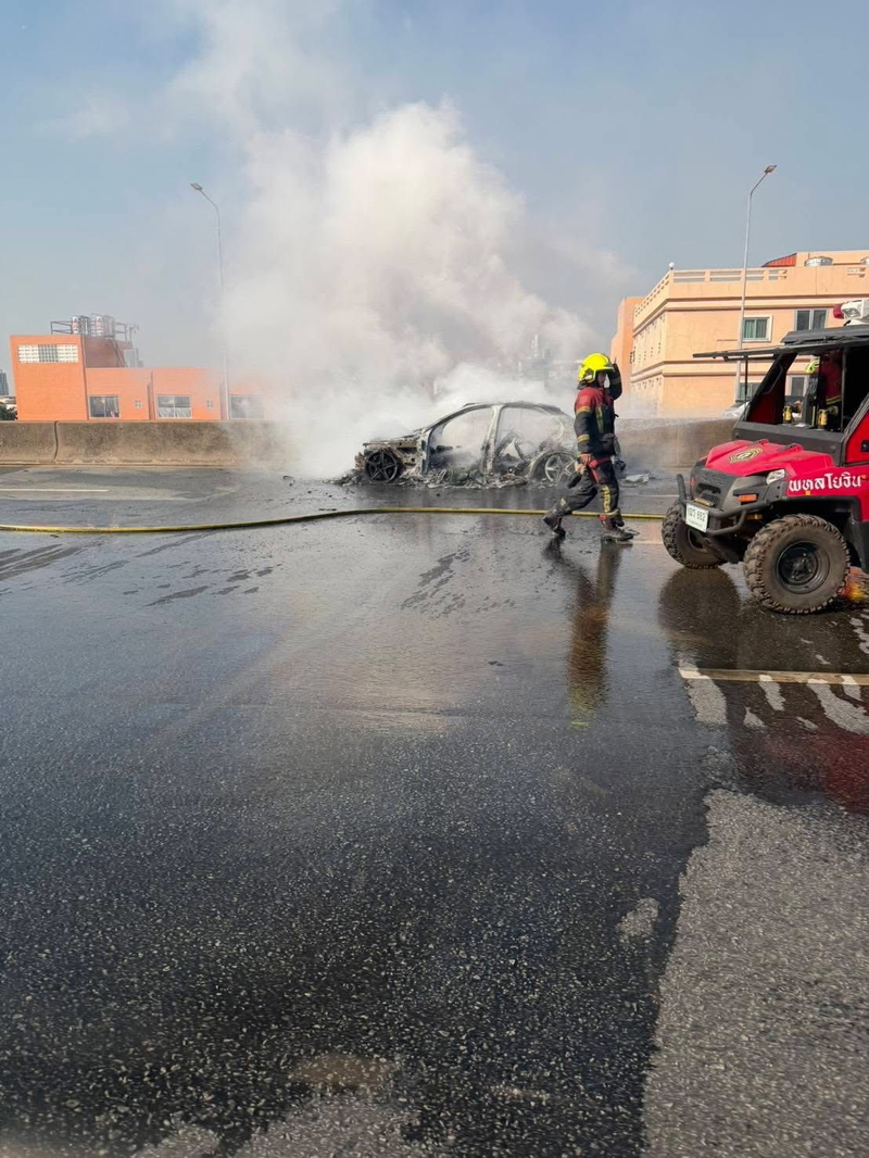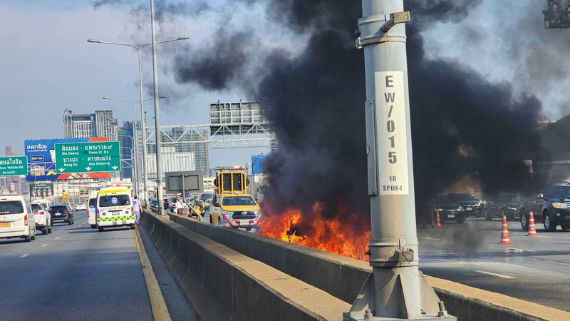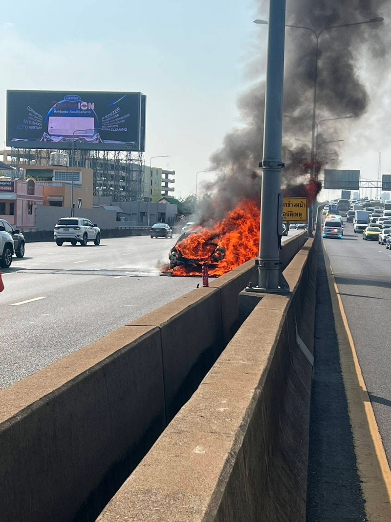 【タイ】バンコク都パヤータイ区内の高速道路で3月21日午後3時55分ごろ、走行中の乗用車が炎上する事故が発生した。運転手は車外に避難し無事だった。