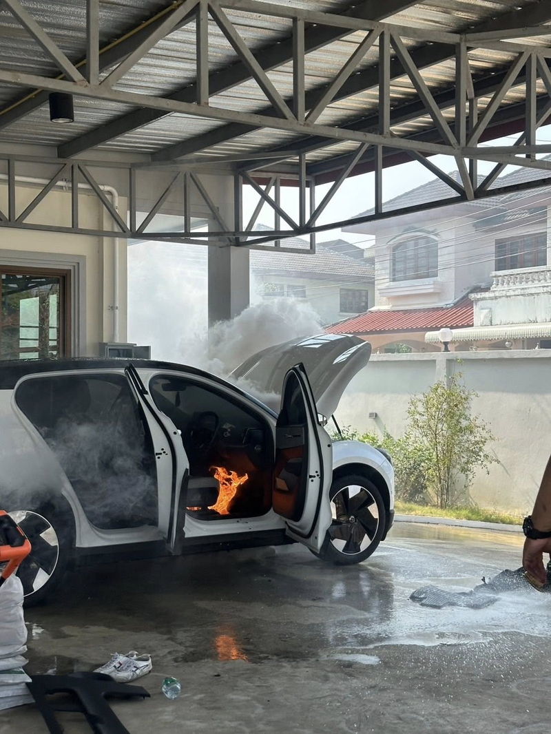 【タイ】バンコク都バーンケー区内の住宅地で3月25日午後3時10分すぎ、電気自動車(EV)が炎上した。人的被害は報告されていない。