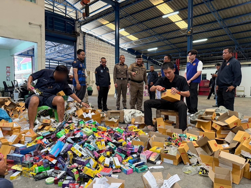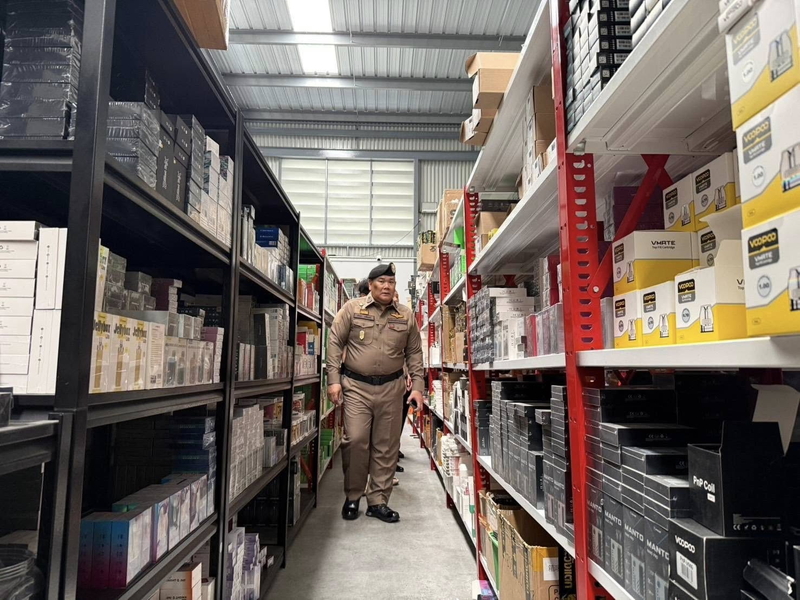 今回の摘発は、バンコク首都警察と第1警察管区が合同で実施。倉庫内では電子たばこ本体および関連製品2万点以上が見つかり、押収額は2億バーツ規模に上った。現場での逮捕者は7人でいずれも雇われ作業員。注文に応じて商品を梱包し、ワゴン車で配送業者に持ち込んでいたという。押収したパソコンには、1日1000件を超える注文の記録が残っていた。