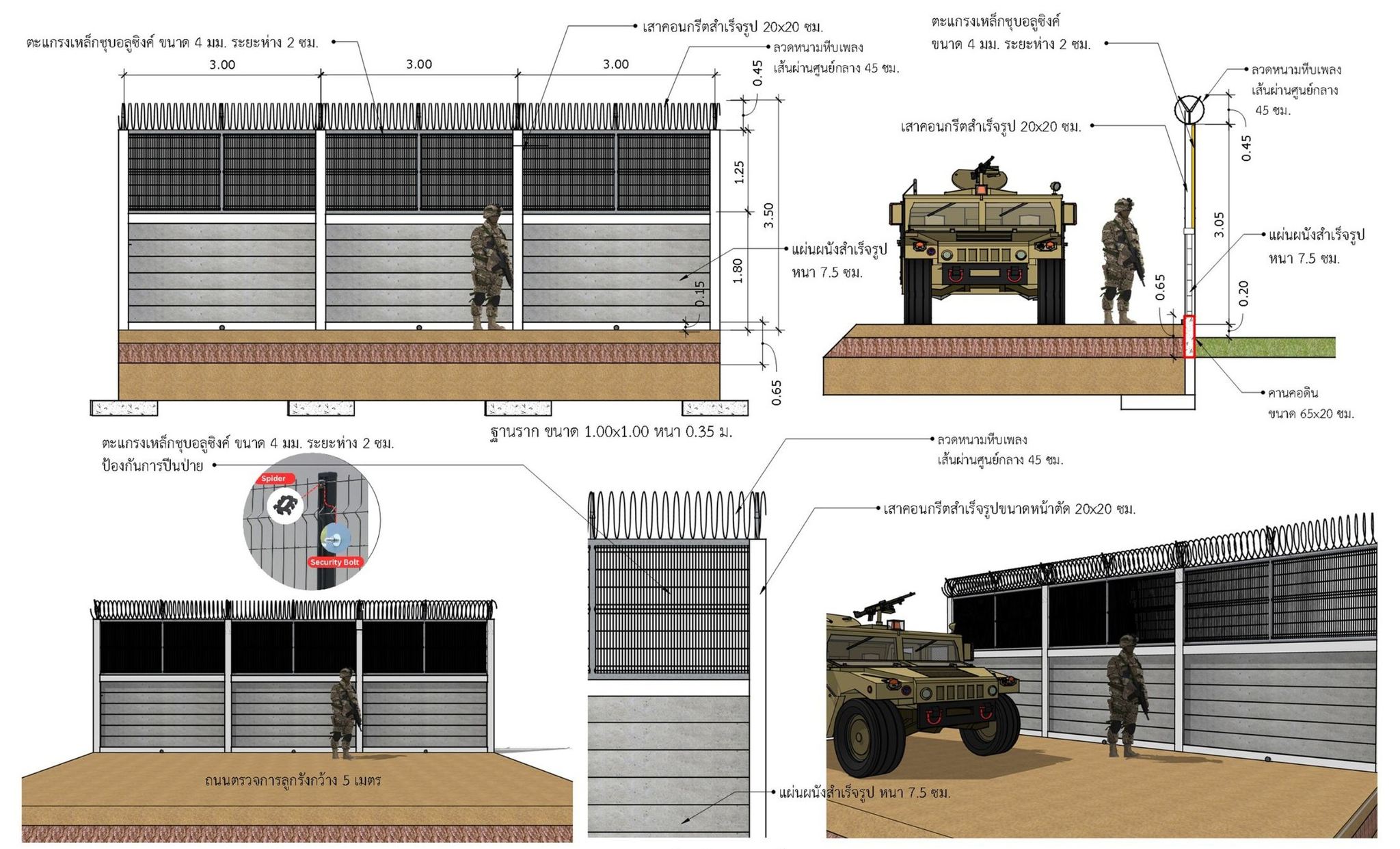 パナー・クレ―オプロートトゥック陸軍司令官やウクリット・ブンタノーンタット国軍司令官らが、タイ王室のジュラポーン王女に報告、設計図を提出した。計画によると、フェンスは高さ3.5メートルで、下部はプレストレストコンクリート(PC)、上部は亜鉛メッキ鋼格子に有刺鉄線を組み合わせた構造となる。強行突破やよじ登り、地下からの侵入にも耐えられる設計だという。